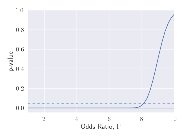 Figure 3 shows the range in p-values as we consider larger departures from the ideal of a randomized experiment. The dashed line shows the significance threshold, 0.05. We see that when \( \Gamma > 8, \) the upper bound on the p-value exceeds this threshold, so the sensitivity of the study is around \( \Gamma^\star = 8. \)